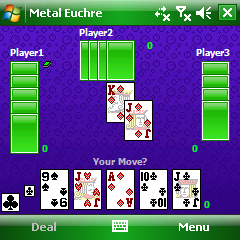 Metal Euchre is the top Euchre Game for your Windows Mobile Pro device. It features great gameplay with challenging AI and customizations to allow you to enjoy a quick game of Euchre or Dirty Clubs wherever you may be.
